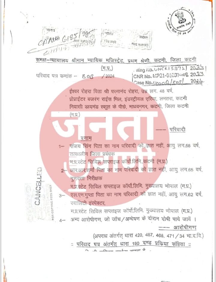 बजरंग राइस मिल के शासकीय कस्टम मिलिंग चावल की फर्जी रिपोर्ट बनाने वाले नागरिक आपूर्ति निगम के तत्कालीन जिला प्रबंधक संजय सिंग, नागरिक आपूर्ति निगम मुख्यालय भोपाल के गुणवत्ता नियंत्रक आर.आर.शर्मा, एल.एन.गुप्ता एवं अन्य के विरुद्ध न्यायालय ने एफआईआर दर्ज करने के आदेश जारी किये:-मामला इस प्रकार है कि बजरंग राइस मिल के प्रोपराइटर ईश्वर रोहरा द्वारा दिनांक 23 मई 2022 को नागरिक आपूर्ति निगम के तत्कालीन जिला प्रबंधक संजय सिंग को लोकायुक्त जबलपुर से 60,000/- की रिश्वत लेते रंगे हाथ पकड़वाया था,तब संजय सिंग ने ईश्वर रोहरा से बदला लेने के लिए नागरिक आपूर्ति निगम के मुख्यालय भोपाल से अपने मातहत उच्च अधिकारियों को बोल कर गुणवत्ता निरीक्षक आर आर शर्मा एवं एल एन गुप्ता को 29 मई 2022 को कटनी बुलवा लिया और mpwlc के अधिकृत पायल,पीईजी आदि गोदामों में नागरिक आपूर्ति निगम के द्वारा ही स्वीकृत ईश्वर रोहरा की बजरंग राइस मिल के चावल को फेल करवा दिया और इस आधार पर बजरंग राइस मिल का शासकीय मिलिंग का कार्य बंद करवा दिया और इस फेल चावल को बदलने का नोटिस जारी कर दिया ।कहते हैं कि चोर चोरी करता है, तो कोई न कोई सुराग छोड़ जाता है, ऐसे में इन तीनों से गलती ये हो गई कि पीईजी गोदाम में 3480 बोरी चावल के 3 स्टैक की फेल की जो रिपोर्ट बनाई गई थी, वो वास्तविकता में 2 स्टैक 3,480 बोरी के थे।जब माननीय उच्च न्यायालय जबलपुर में इस जांच के खिलाफ याचिका दायर की गई तो माननीय उच्च न्यायालय जबलपुर के आदेश पर प्रबंध संचालक, नागरिक आपूर्ति निगम द्वारा दूसरी जांच टीम से उक्त चावल की जांच कराई, जिसमें लगभग चावल पास हो गया,किंतु पीईजी गोदाम में चावल की जांच रिपोर्ट में तीसरा स्टैक 3,480 बोरी चावल का नहीं मिला, केवल 2 ही स्टैक वहाँ पाये गये ।इस फर्जी 3,480 बोरी जांच रिपोर्ट के आधार पर ईश्वर रोहरा प्रो. बजरंग राइस मिल द्वारा क्रमश: स्टेप बाय स्टेप पहले थाना कुठला ,फिर पुलिस अधीक्षक कटनी को इस आधार पर अपराध कायमी करने का आवेदन दिया गया, पुन: फिर से पुलिस अधीक्षक को आवेदन दिया गया, जब इनके द्वारा कोई कार्यवाही नहीं की गई तो माननीय उच्च न्यायालय जबलपुर में याचिका दायर की गई,तब माननीय उच्च न्यायालय जबलपुर से प्रमुख सचिव, गृह मंत्रालय को प्रकरण की सुनवाई कर आदेश पारित करने हेतु आदेशित किया ।जिस पर सुनवाई उपरांत प्रमुख सचिव, गृह मंत्रालय ने जिला न्यायालय में धारा 156(3) के तहत केस फाइल करने हेतु आदेश जारी किया।जिस पर माननीय जिला न्यायालय में वाद दायर किया गया,और प्रकरण में सुनवाई उपरांत कुठला थाने को एफ.आई.दर्ज करने हेतु आदेशित किया ।
