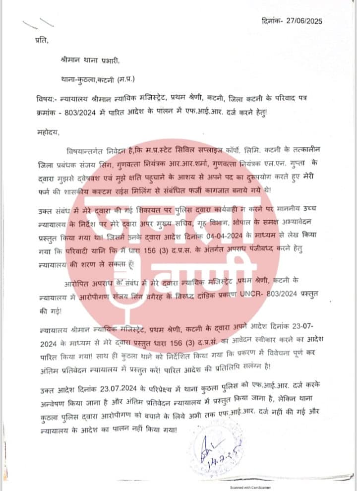 बजरंग राइस मिल के शासकीय कस्टम मिलिंग चावल की फर्जी रिपोर्ट बनाने वाले नागरिक आपूर्ति निगम के तत्कालीन जिला प्रबंधक संजय सिंग, नागरिक आपूर्ति निगम मुख्यालय भोपाल के गुणवत्ता नियंत्रक आर.आर.शर्मा, एल.एन.गुप्ता एवं अन्य के विरुद्ध न्यायालय ने एफआईआर दर्ज करने के आदेश जारी किये:-मामला इस प्रकार है कि बजरंग राइस मिल के प्रोपराइटर ईश्वर रोहरा द्वारा दिनांक 23 मई 2022 को नागरिक आपूर्ति निगम के तत्कालीन जिला प्रबंधक संजय सिंग को लोकायुक्त जबलपुर से 60,000/- की रिश्वत लेते रंगे हाथ पकड़वाया था,तब संजय सिंग ने ईश्वर रोहरा से बदला लेने के लिए नागरिक आपूर्ति निगम के मुख्यालय भोपाल से अपने मातहत उच्च अधिकारियों को बोल कर गुणवत्ता निरीक्षक आर आर शर्मा एवं एल एन गुप्ता को 29 मई 2022 को कटनी बुलवा लिया और mpwlc के अधिकृत पायल,पीईजी आदि गोदामों में नागरिक आपूर्ति निगम के द्वारा ही स्वीकृत ईश्वर रोहरा की बजरंग राइस मिल के चावल को फेल करवा दिया और इस आधार पर बजरंग राइस मिल का शासकीय मिलिंग का कार्य बंद करवा दिया और इस फेल चावल को बदलने का नोटिस जारी कर दिया ।कहते हैं कि चोर चोरी करता है, तो कोई न कोई सुराग छोड़ जाता है, ऐसे में इन तीनों से गलती ये हो गई कि पीईजी गोदाम में 3480 बोरी चावल के 3 स्टैक की फेल की जो रिपोर्ट बनाई गई थी, वो वास्तविकता में 2 स्टैक 3,480 बोरी के थे।जब माननीय उच्च न्यायालय जबलपुर में इस जांच के खिलाफ याचिका दायर की गई तो माननीय उच्च न्यायालय जबलपुर के आदेश पर प्रबंध संचालक, नागरिक आपूर्ति निगम द्वारा दूसरी जांच टीम से उक्त चावल की जांच कराई, जिसमें लगभग चावल पास हो गया,किंतु पीईजी गोदाम में चावल की जांच रिपोर्ट में तीसरा स्टैक 3,480 बोरी चावल का नहीं मिला, केवल 2 ही स्टैक वहाँ पाये गये ।इस फर्जी 3,480 बोरी जांच रिपोर्ट के आधार पर ईश्वर रोहरा प्रो. बजरंग राइस मिल द्वारा क्रमश: स्टेप बाय स्टेप पहले थाना कुठला ,फिर पुलिस अधीक्षक कटनी को इस आधार पर अपराध कायमी करने का आवेदन दिया गया, पुन: फिर से पुलिस अधीक्षक को आवेदन दिया गया, जब इनके द्वारा कोई कार्यवाही नहीं की गई तो माननीय उच्च न्यायालय जबलपुर में याचिका दायर की गई,तब माननीय उच्च न्यायालय जबलपुर से प्रमुख सचिव, गृह मंत्रालय को प्रकरण की सुनवाई कर आदेश पारित करने हेतु आदेशित किया ।जिस पर सुनवाई उपरांत प्रमुख सचिव, गृह मंत्रालय ने जिला न्यायालय में धारा 156(3) के तहत केस फाइल करने हेतु आदेश जारी किया।जिस पर माननीय जिला न्यायालय में वाद दायर किया गया,और प्रकरण में सुनवाई उपरांत कुठला थाने को एफ.आई.दर्ज करने हेतु आदेशित किया ।
