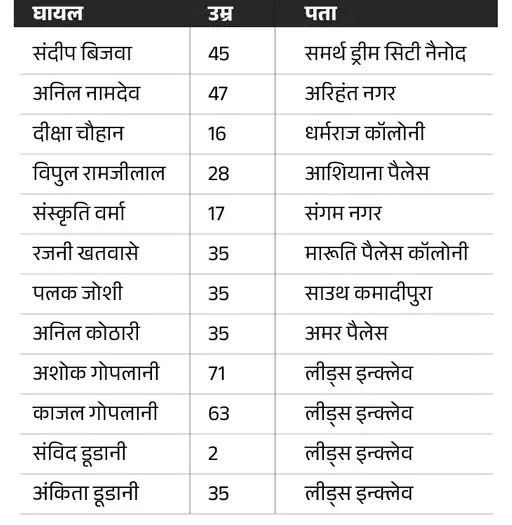 12 घायलों में से गीतांजलि अस्पताल में 6, वर्मा यूनियन अस्पताल में 2, बांठिया अस्पताल में 2, अरबिंदो अस्पताल में एक और भंडारी अस्पताल में एक व्यक्ति को भर्ती कराया गया है। 2 घायलों की हालत गंभीर बताई जा रही है।
