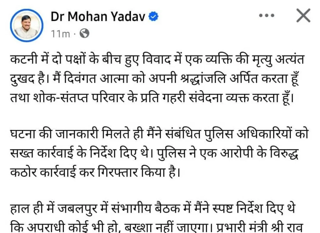 कटनी हत्याकांड: सीएम डॉ. मोहन यादव ने जताया दुख, प्रभारी मंत्री शोक संतप्त परिवार से करेंगे मुलाकातकटनी/भोपाल। मध्य प्रदेश के मुख्यमंत्री डॉ. मोहन यादव ने कटनी के कैमोर में हुए विवाद में भाजपा कार्यकर्ता नीलेश रजक की मृत्यु पर गहरा दुख व्यक्त किया है। मुख्यमंत्री ने घटना पर संवेदना व्यक्त करते हुए सख्त कार्रवाई के निर्देश दिए हैं और प्रभारी मंत्री राव उदय प्रताप सिंह को तत्काल कैमोर पहुंचकर शोक संतप्त परिवार से मिलने के लिए कहा है।सीएम ने ‘एक्स’ पर व्यक्त की संवेदनामुख्यमंत्री डॉ. यादव ने सोशल मीडिया प्लेटफॉर्म ‘एक्स’ पर लिखा, “कटनी में दो पक्षों के बीच हुए विवाद में एक व्यक्ति की मृत्यु अत्यंत दुखद है। मैं दिवंगत आत्मा को अपनी श्रद्धांजलि अर्पित करता हूं तथा शोक-संतप्त परिवार के प्रति गहरी संवेदना व्यक्त करता हूं।”अपराधी को बख्शा नहीं जाएगामुख्यमंत्री ने बताया कि घटना की जानकारी मिलते ही उन्होंने संबंधित पुलिस अधिकारियों को सख्त कार्रवाई के निर्देश दिए थे, जिसके बाद पुलिस ने एक आरोपी को गिरफ्तार कर कठोर कार्रवाई की है। उन्होंने जबलपुर में हुई संभागीय बैठक का जिक्र करते हुए दोहराया कि “अपराधी कोई भी हो, बख्शा नहीं जाएगा।”कानून-व्यवस्था पर सख्तीसीएम डॉ. यादव ने स्पष्ट किया कि राज्य में कानून और व्यवस्था से किसी भी प्रकार का समझौता नहीं किया जाएगा। उन्होंने चेतावनी देते हुए कहा, “जो कानून-व्यवस्था को चुनौती देगा, उसे उसके कृत्य का परिणाम अवश्य भुगतना पड़ेगा।”प्रभारी मंत्री राव उदय प्रताप सिंह मुख्यमंत्री के निर्देश पर कटनी जाकर मृतक नीलेश रजक के परिवार से भेंट करेंगे और उन्हें सरकार की ओर से ढांढस बंधाएंगे।