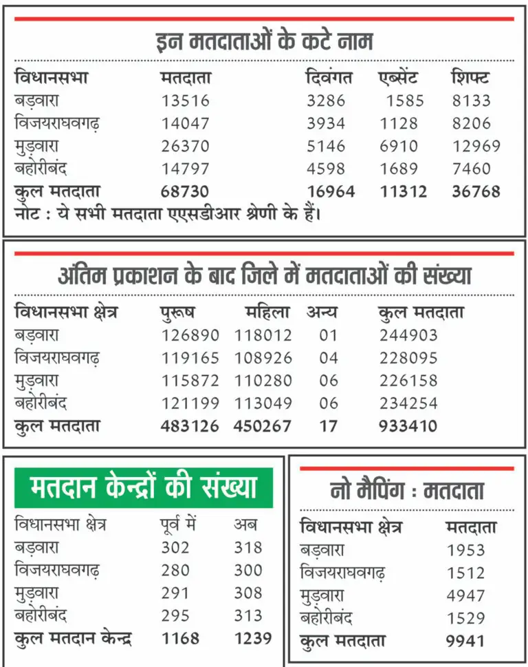 मतदान केंद्र बढ़े जिले में मतदान केंद्रों की संख्या 1,168 से बढ़कर 1,239 हो गई है। 71 नए मतदान केंद्र बनाए गए हैं।