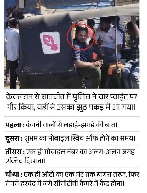 मोबाइल की लोकेशन और सीडीआर से पकड़ा गया झूठhttpsपुलिस ने करण और शुभम के मोबाइल की लोकेशन और सीडीआर निकलवाई। शुभम का मोबाइल रात 10 बजे स्विच ऑफ हुआ था, जबकि केवलराम कीर ने रात 12 बजे शुभम और करण का रेत कंपनी के कर्मचारियों से विवाद होने की बात कही थी।