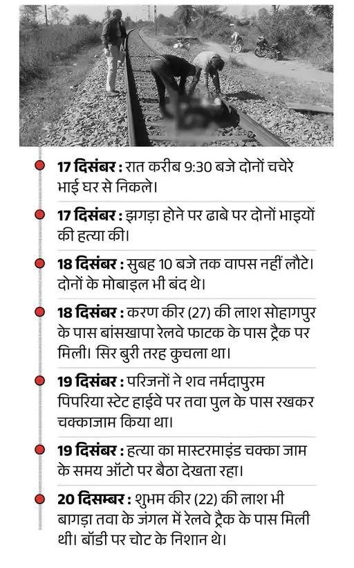 नर्मदापुरम में लापता दो भाइयों के शव अलग-अलग दिन रेलवे ट्रैक पर मिले। एक के सिर को इतनी बेरहमी से कुचला गया था कि पहचानने में काफी मुश्किलें आईं। आरोपियों ने वारदात को आत्महत्या में बदलने के लिए दोनों की बॉडी, मोबाइल और स्कूटी अलग-अलग दिशाओं में फेंके थे।