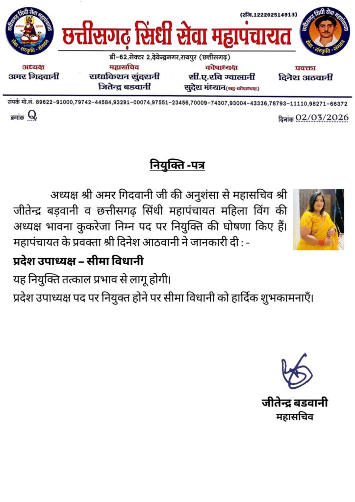तिल्दा-नेवरा। छत्तीसगढ़ सिंधी सेवा महापंचायत द्वारा संगठन विस्तार के तहत महत्वपूर्ण नियुक्ति की घोषणा की गई है। अध्यक्ष अमर गिदवानी की अनुशंसा पर महासचिव जितेन्द्र बड़वानी तथा महिला विंग की अध्यक्ष भावना कुकरेजा की सहमति से सीमा विधानी को प्रदेश उपाध्यक्ष पद पर नियुक्त किया गया है। इस संबंध में महापंचायत के प्रवक्ता दिनेश आठवानी ने जानकारी देते हुए बताया कि यह नियुक्ति तत्काल प्रभाव से लागू होगी।सीमा विधानी को प्रदेश उपाध्यक्ष नियुक्त किए जाने पर समाज के लोगों में हर्ष का माहौल है और उन्हें लगातार शुभकामनाएं मिल रही हैं। तिल्दा-नेवरा में पुंज्या सिंधी पंचायत के अध्यक्ष शमनलाल खूबचंदानी ने सीमा विधानी को नई जिम्मेदारी मिलने पर बधाई देते हुए कहा कि उनके अनुभव और सक्रियता से समाज को नई दिशा मिलेगी।वहीं छत्तीसगढ़ सिंधी महापंचायत के प्रदेश उपाध्यक्ष विकास सुखवानी ने भी सीमा विधानी को बधाई एवं शुभकामनाएं देते हुए आशा व्यक्त की कि वे समाज के विकास और संगठन को मजबूत बनाने में महत्वपूर्ण भूमिका निभाएंगी।समाज के अन्य पदाधिकारियों और सदस्यों ने भी सीमा विधानी को नई जिम्मेदारी मिलने पर शुभकामनाएं दी